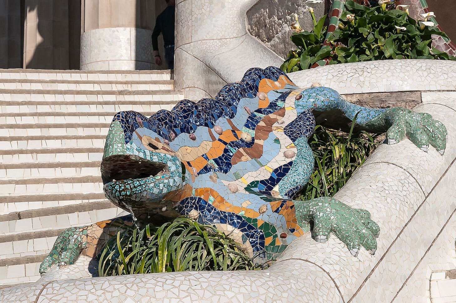 Beyond the bench, trencadís adorns the park’s monumental staircase, the salamander fountain known as “El Drac,” and the rooftop surfaces of the pavilions. The technique allowed Gaudí and his collaborator Josep Maria Jujol to achieve effects that traditional ceramic tiling could not: irregular patterns, shimmering reflections, and vibrant color schemes that mirrored the unpredictability of nature. Each piece of broken ceramic became a tessera in a larger organic composition, echoing the patterns of shells, flowers, and reptilian scales.