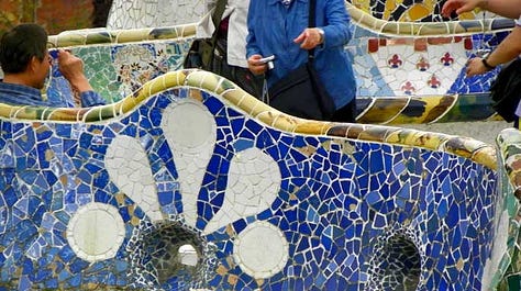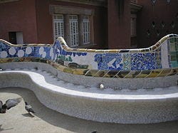 Park Güell (1900–1914), funded by Eusebi Güell, serves as the apotheosis of Gaudí’s trencadís. The park’s iconic serpentine bench, stretching along the terrace with undulating curves, is covered in a kaleidoscope of broken ceramic fragments. The irregular shapes and multicolored pieces not only enhance its visual dynamism but also conform perfectly to the ergonomics of the human body, blending utility with ornament. The use of trencadís here exemplifies Gaudí’s philosophy that decoration should be inseparable from structure and function.