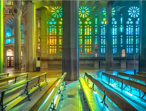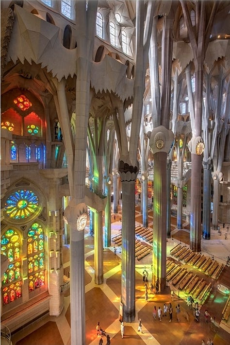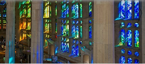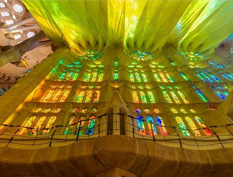 The interior continues this symbolic layering. The forest of branching columns recalls both the natural order of God’s creation and the Gothic tradition of vertical ascent toward the divine. The vaults, decorated with geometric stars and foliage motifs, evoke heaven’s firmament. Light functions as a metaphysical symbol. Stained-glass windows by Joan Vila-Grau saturate the interior with shifting hues, marking the passage of time as a reflection of divine presence. Morning light floods the Nativity side with warm colors, while evening illuminates the Passion side with cooler tones, reinforcing the liturgical symbolism of life and death.