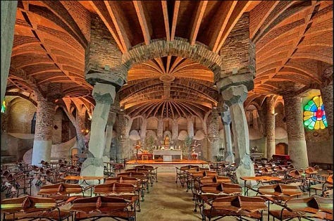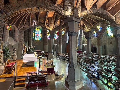 The Crypt of Colònia Güell (1898–1914) stands as one of Antoni Gaudí’s most important experimental projects and a crucial precursor to the Sagrada Família. Commissioned by his patron Eusebi Güell for the workers’ community at his textile colony in Santa Coloma de Cervelló, the crypt was intended as part of a larger church complex that was never completed. Nevertheless, the crypt itself became a laboratory for Gaudí’s structural innovations and symbolic ambitions.