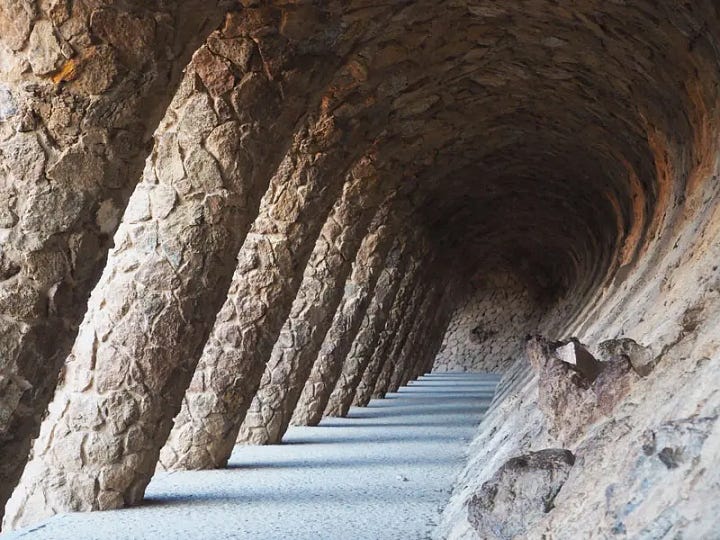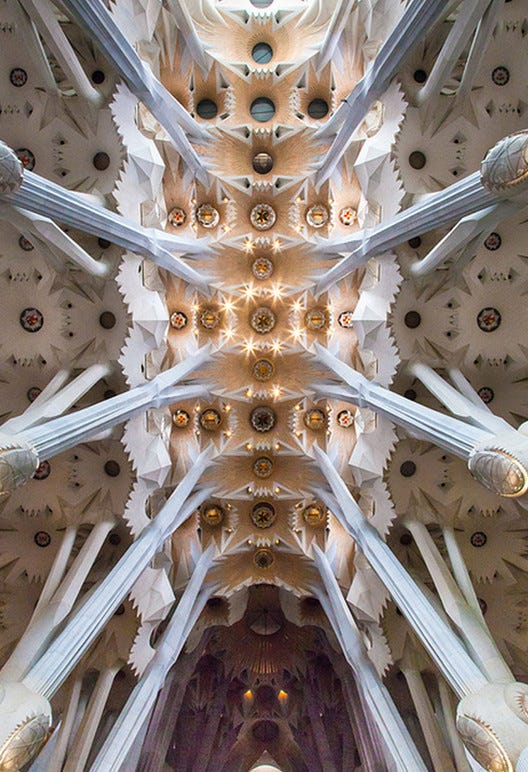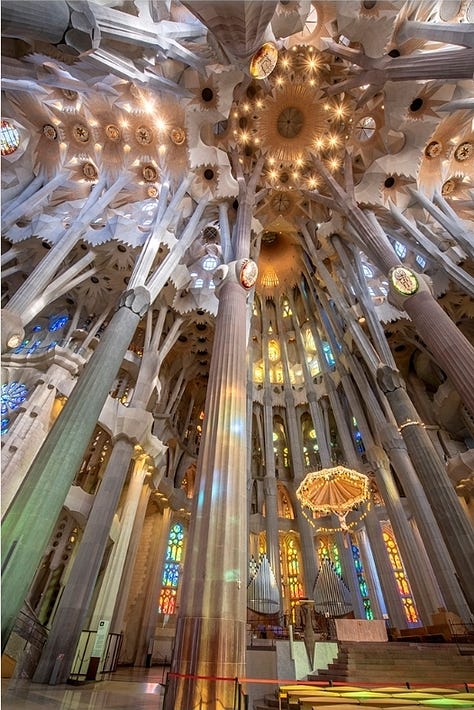 Antoni Gaudí’s architecture is inseparable from nature, both as inspiration and as a structural model. His conviction that “originality consists of returning to the origin” reflects his belief that the natural world provided the most authentic blueprint for artistic and architectural creation (Collins 17). Rather than imposing rigid geometric systems, Gaudí drew upon organic forms (curves, spirals, parabolic arches, and branching columns) that echoed the structures of plants, animals, and geological formations. This integration of natural patterns was not merely decorative but structural, making his buildings appear alive and integrated with their surroundings.