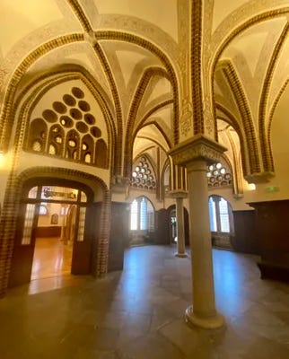 Symbolically, the crypt fuses natural and religious imagery. The brick and basalt walls create a grotto-like atmosphere, evoking both the humility of early Christian worship and the forms of caves and roots. The stained-glass windows, designed with floral motifs in vibrant colors, filter light into the space in ways that simulate the dappled illumination of a forest canopy. This interplay of natural forms and sacred symbolism exemplifies Gaudí’s conviction that divine creation could be mirrored in architectural design.