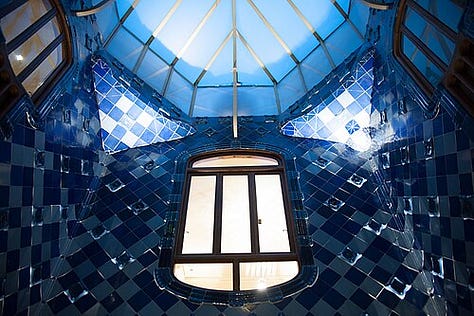In residential works such as the Casa Batlló (1904–1906), Gaudí deployed light to enhance the chromatic symbolism of his interiors. The central light well was tiled in varying shades of blue, darker at the top and lighter at the bottom, ensuring even distribution of daylight throughout the building. This careful modulation allowed natural light to cascade into every room, reducing the need for artificial illumination while creating a dynamic spatial experience.