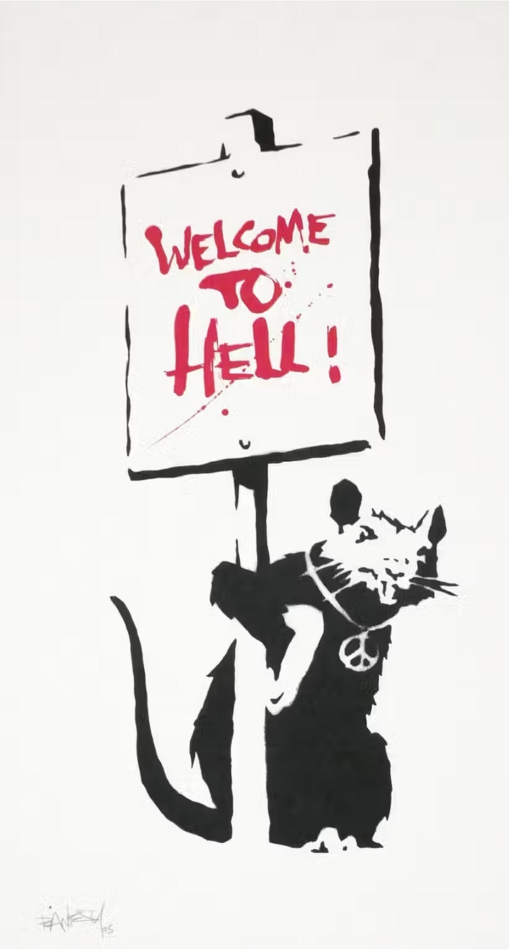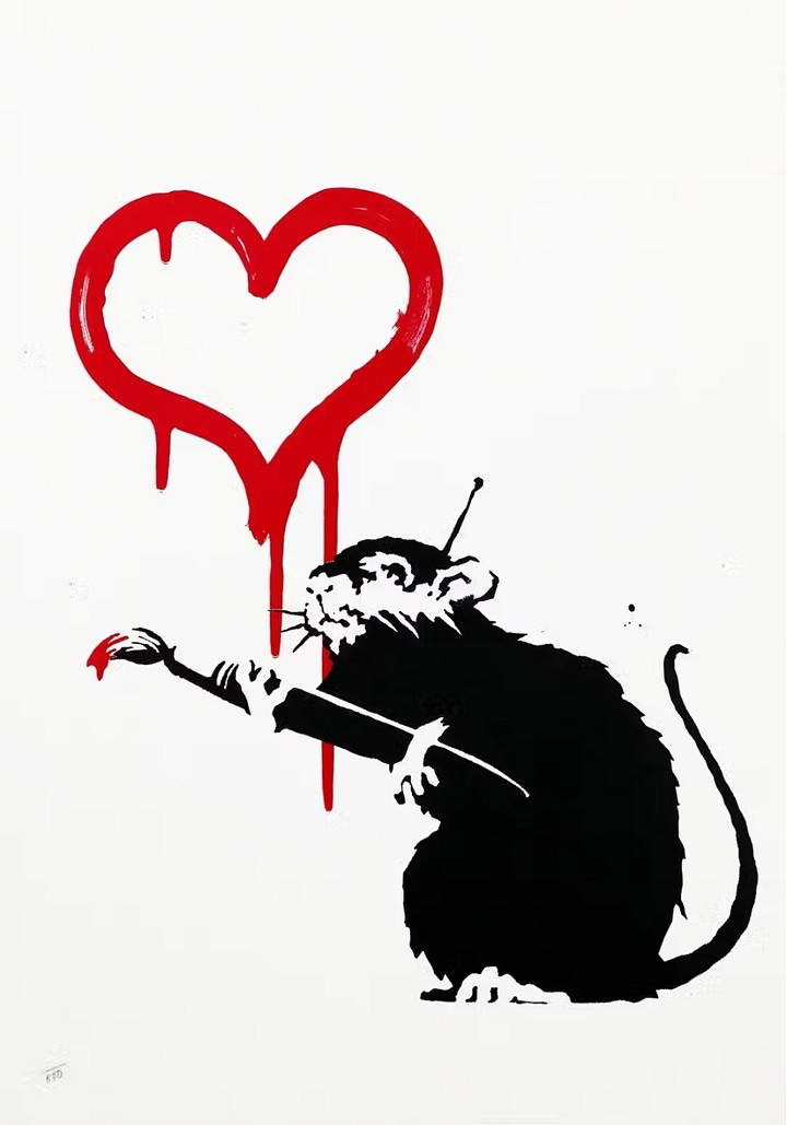 Banksy’s graffiti blends dark humor with sharp social commentary. Works such as Girl with Balloon (2002), Kissing Coppers (2004), and There Is Always Hope juxtapose innocence with irony, critiquing war, consumerism, surveillance, and political hypocrisy (Ellsworth-Jones 58–61). His rats, recurring figures in his oeuvre, symbolize resilience and subversion, thriving in the margins of society much like graffiti itself (Lewisohn 112–13).