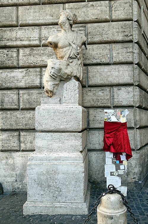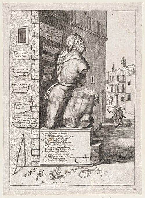 At the same time, ordinary citizens took part in wall-writing as satire and commentary. Florence in particular was famous for its “pasquinades”; anonymous lampoons or verses posted on statues and walls mocking politicians, clergy, or rival factions (Starn 53–55). These writings could be humorous, biting, or dangerously subversive. In Rome, the statue of Pasquino became the city’s unofficial bulletin board for such critiques, giving its name to the entire tradition.