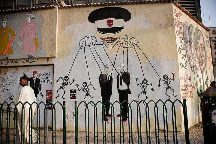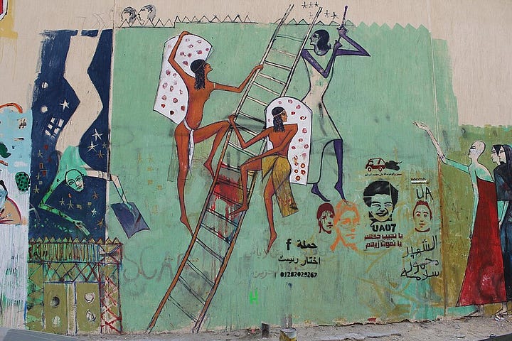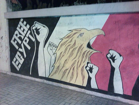 In Egypt, graffiti flourished in Cairo’s Tahrir Square during the 2011 revolution. Walls were covered with portraits of those killed in protests, slogans denouncing Hosni Mubarak, and satirical images mocking military and police leaders (El-Din 43–45). These works were often ephemeral, painted over by authorities only to be re-created overnight. As art historian Bahia Shehab notes, graffiti became “a chronicle of the revolution,” documenting events in real time and ensuring that the dead were not forgotten (Shehab 22–23).