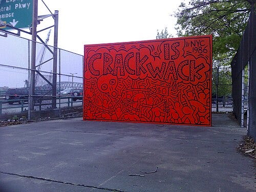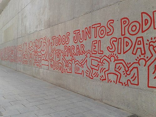 Keith Haring first gained attention by drawing bold, cartoon-like chalk figures on unused advertising panels in subway stations. His simplified lines and radiant figures made his work instantly recognizable and accessible to commuters (Gruen 54–57). By 1982, he was exhibiting in galleries, and soon after collaborated with Andy Warhol, linking the ethos of graffiti with Pop Art’s commercial savvy. Haring maintained his commitment to public art, producing large-scale murals addressing AIDS awareness, apartheid, and nuclear disarmament, proving that graffiti-inspired art could be both activist and globally resonant (Sussman 102–05).