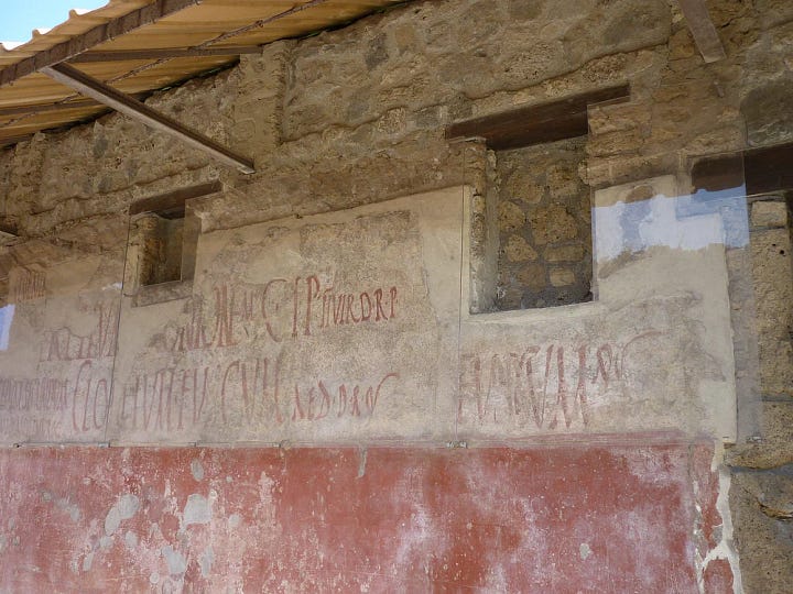 Few archaeological sites illustrate the vibrancy of ancient graffiti as clearly as Pompeii, the Roman city buried by Mount Vesuvius in 79 CE. Excavations have revealed thousands of wall inscriptions scratched or painted across its houses, shops, and public spaces. These texts, estimated at over 11,000 examples, range from political slogans to jokes, love notes, and everyday advertisements (Varone 5–6).