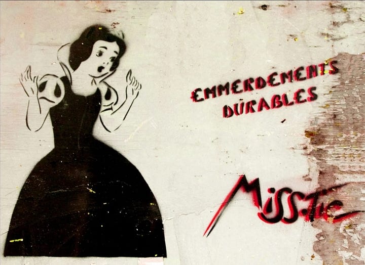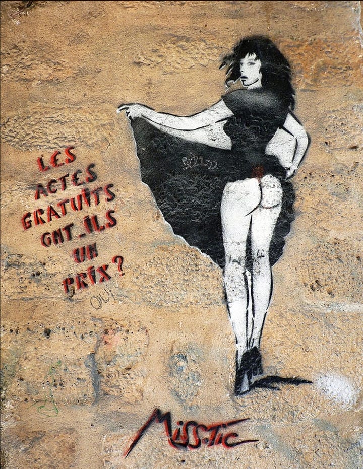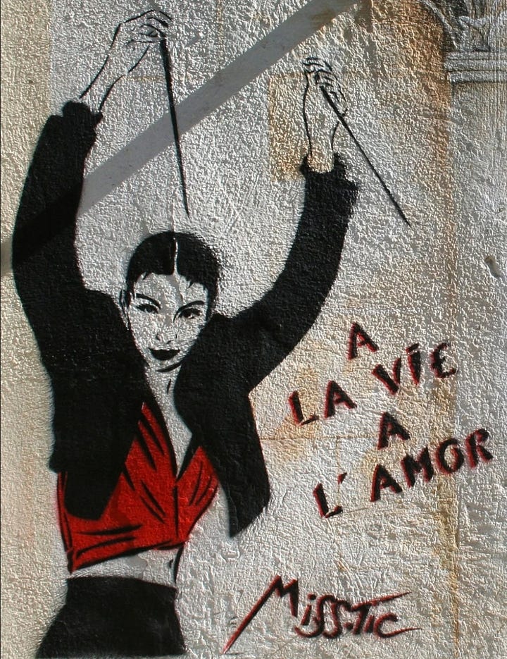 Across the Atlantic, Parisian artist Miss.Tic emerged in the 1980s, pioneering stencil graffiti infused with feminist aphorisms. Her works, depicting sensual female figures alongside sharp poetic texts, confronted gender stereotypes and reclaimed the female body as an empowered subject (Barnes 77–79).