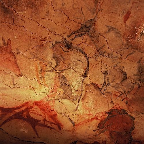 Humanity’s earliest “graffiti” can be traced to Paleolithic cave art, where people inscribed, painted, and stenciled on stone walls tens of thousands of years ago. Two of the most celebrated sites are Lascaux Cave in France (c. 17,000 BCE) and Altamira in Spain (c. 15,000 BCE). These caves contain vibrant animal figures (horses, bison, deer, and aurochs) painted in ochre, hematite, and charcoal, as well as geometric signs and hand stencils. Archaeologists interpret these markings not as decoration but as part of ritual practices tied to fertility, hunting, and cosmology (Lewis-Williams and Clottes 26–34).