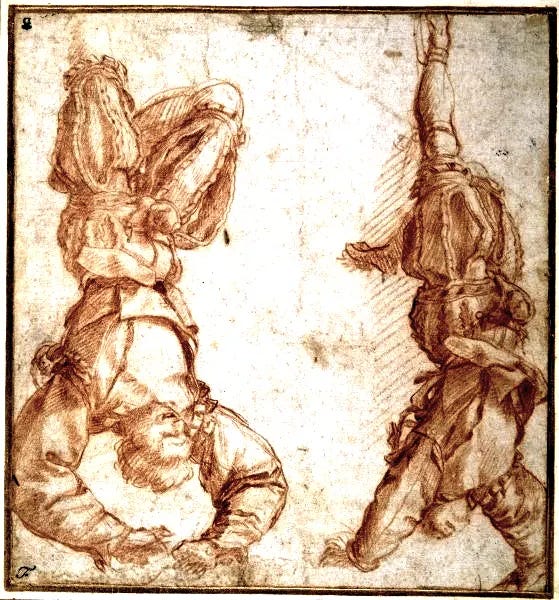 One of the most striking practices was the pittura infamante, “shame paintings.” These were official caricatures of traitors, debtors, or corrupt officials painted on public walls, often in prominent civic spaces like Florence’s Palazzo del Podestà. The condemned figures might be depicted hanging upside down, dressed as fools, or otherwise ridiculed, accompanied by inscriptions naming their crimes (Varriano 102–04). This was graffiti weaponized by governments themselves. Public art intended to disgrace and erase social honor.