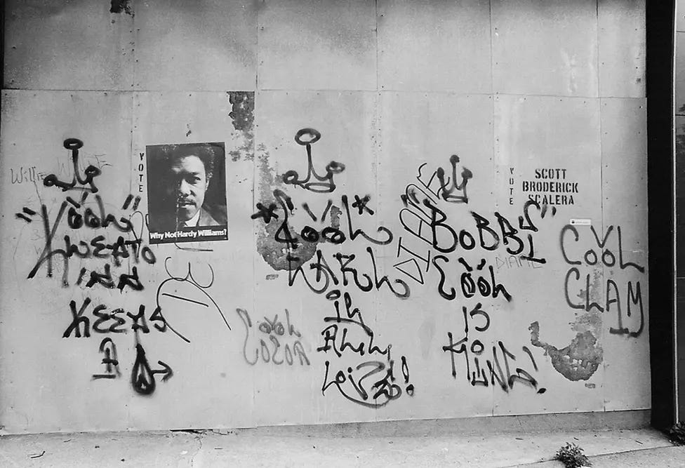 By the late 1970s, graffiti had become inseparable from the emerging hip-hop culture of New York City, alongside DJing, MCing, and breakdancing. Each of these elements represented a form of self-expression born from marginalized communities in the Bronx, and graffiti provided the visual identity of the movement (Chang 121–24).