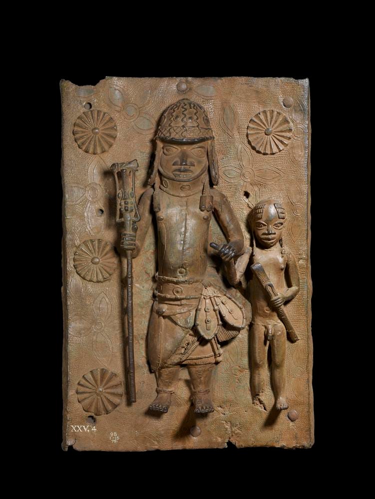 This is where sustained description becomes ethically and aesthetically significant. The Benin plaques are not only historical documents; they are cast relief surfaces designed to catch light, declare hierarchy, and operate within architectural settings. The British Museum entries include material and contextual cues that support object-centered looking, such as technique and comparative references across plaques (British Museum, plaque Af1898,0115.75; British Museum, plaque Af1898,0115.77). The viewer can then ask material questions the label may not pursue such as how relief depth changes across the surface, how patterning creates status signals, how corrosion and patina alter legibility, and how the plaque’s original placement would have structured viewing angles. Objecthood resists narrative because it demands attention to what is physically there.